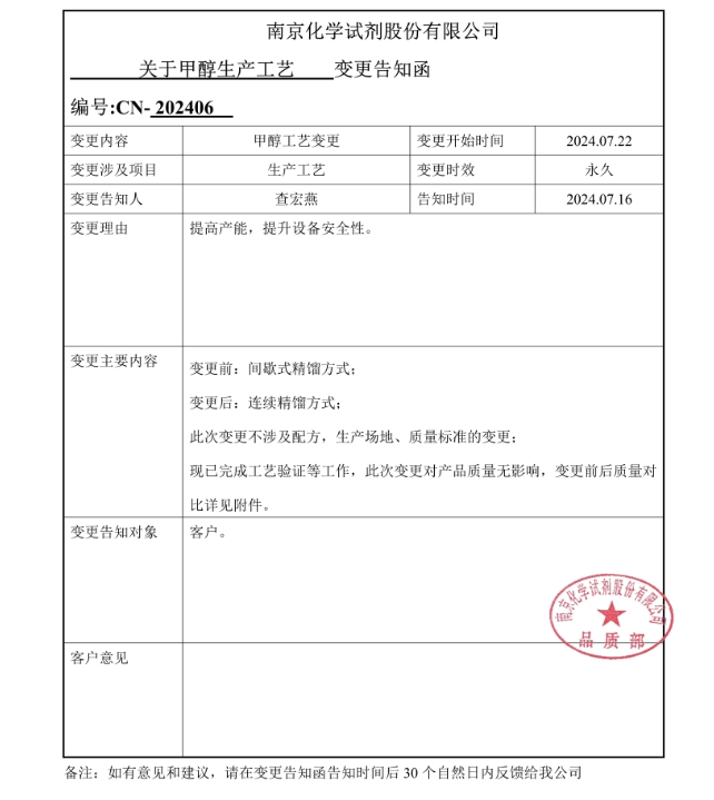 關(guān)于甲醇生產(chǎn)工藝變更告知函